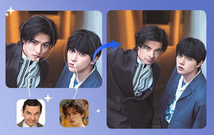 Face swap page describes an HD/1080 option and a simple three-step flow (upload original/target photos, then generate and download)